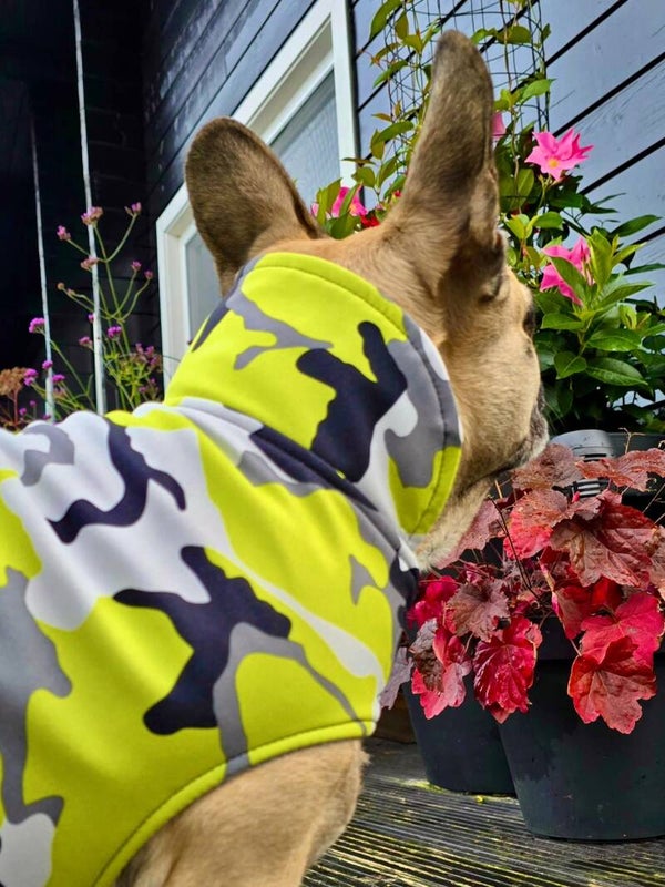 Op de foto's draagt Delpine Caren B hondenjas Master Chief maat XL.