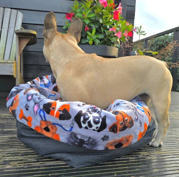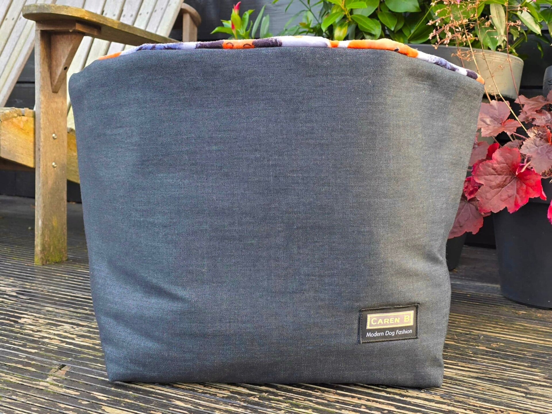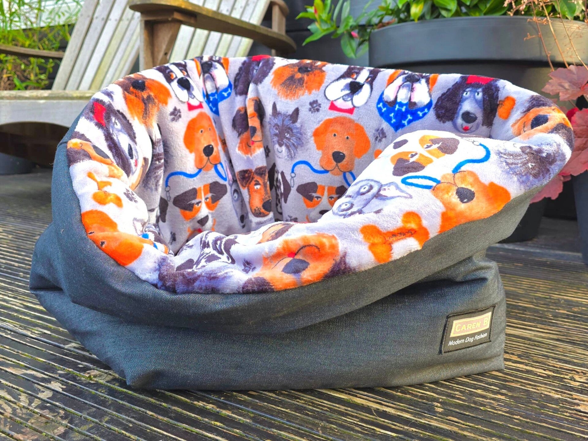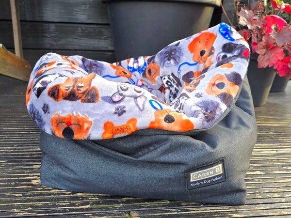 Een hele fijne hondenmand, deze Caren B Snuggle Bucket Jeans and Dogs. Aan de buitenzijde stoere jeans stof, binnenin zit fleece met een leuke print met hondjes.