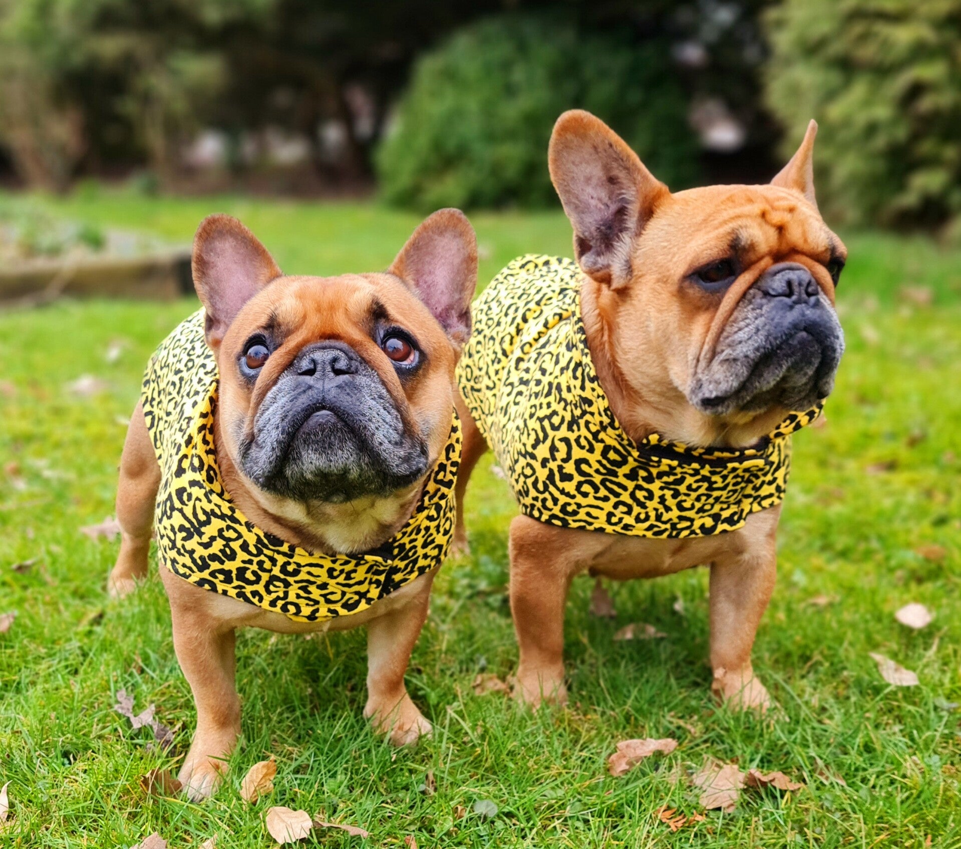 Op de foto's draagt Emmelie Caren B hondenjas yellow leopard maat L en Claire maat XL.