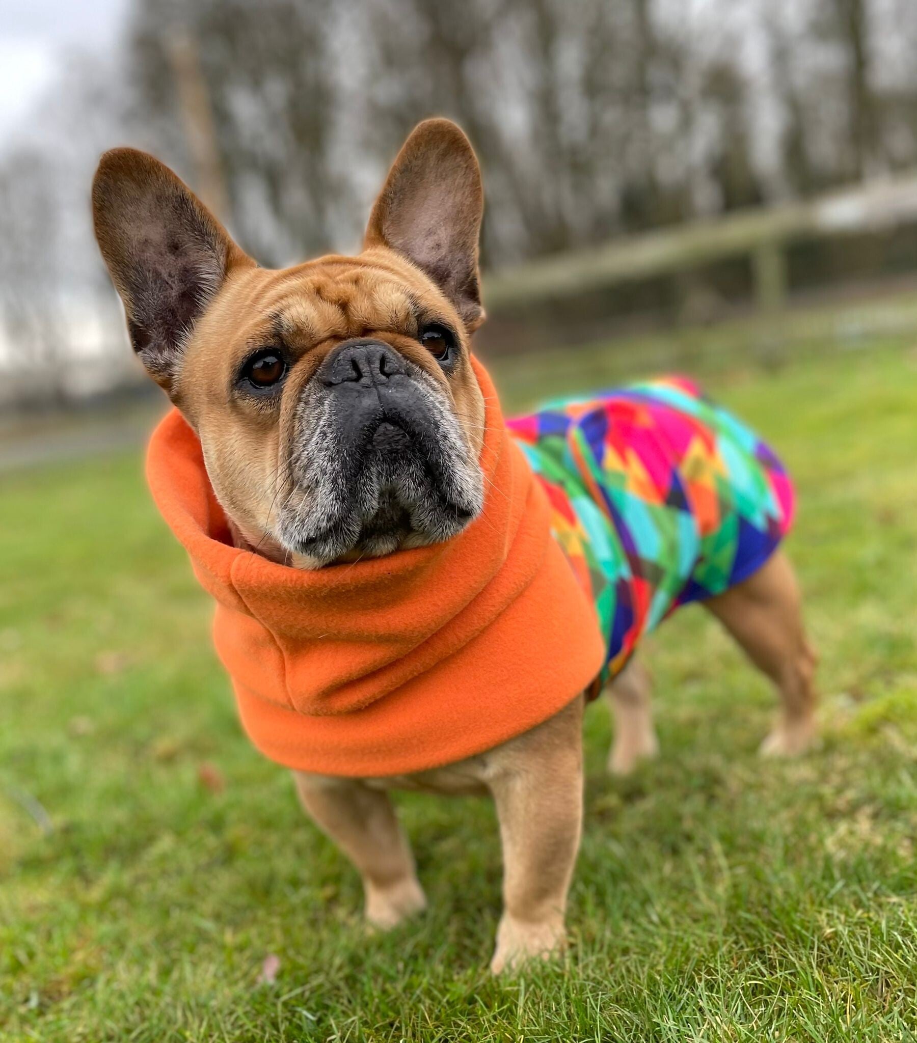 Op de foto's draagt Claire Caren B hondenjas happy colors maat XL.