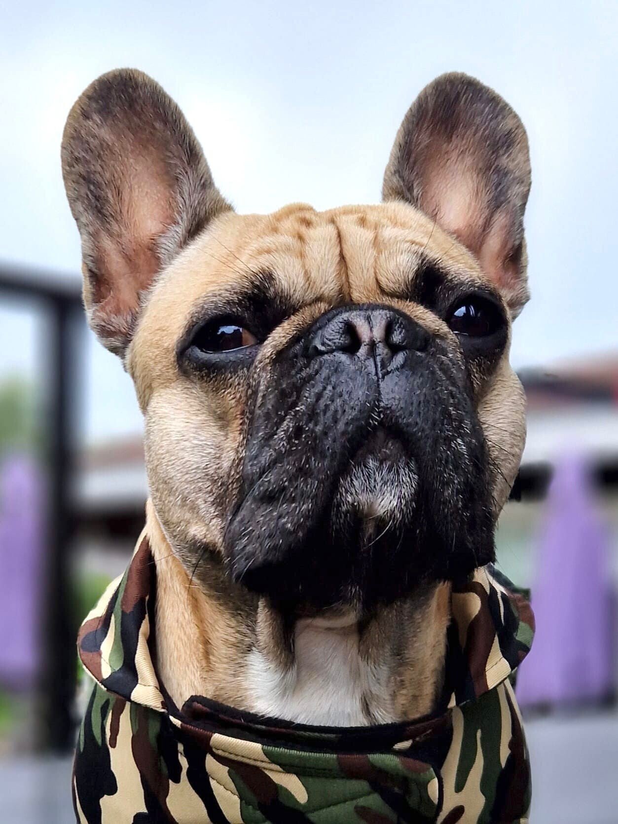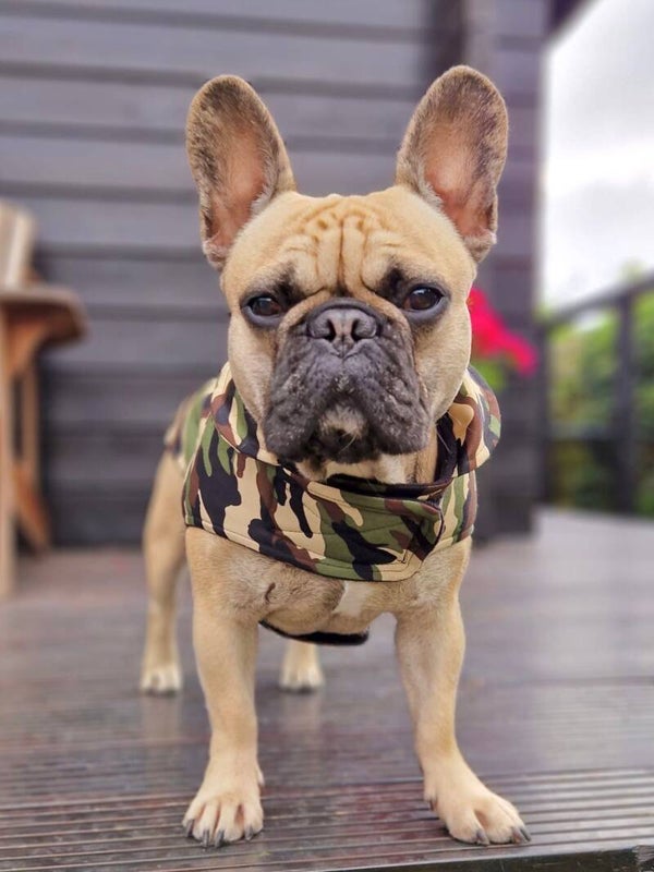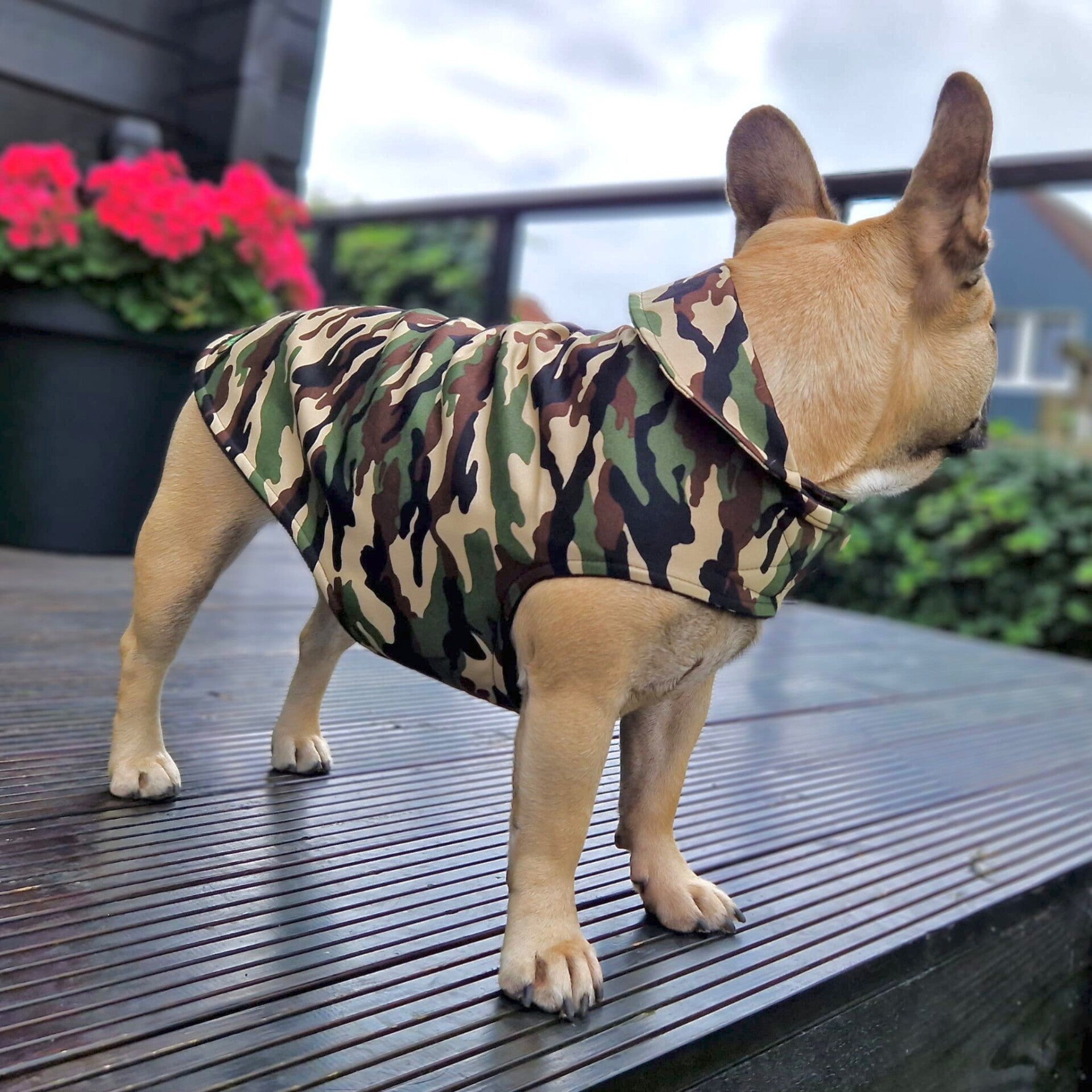 Op de foto's draagt model Delphine Caren B hondenjas Camo Sergeant Major maat XL