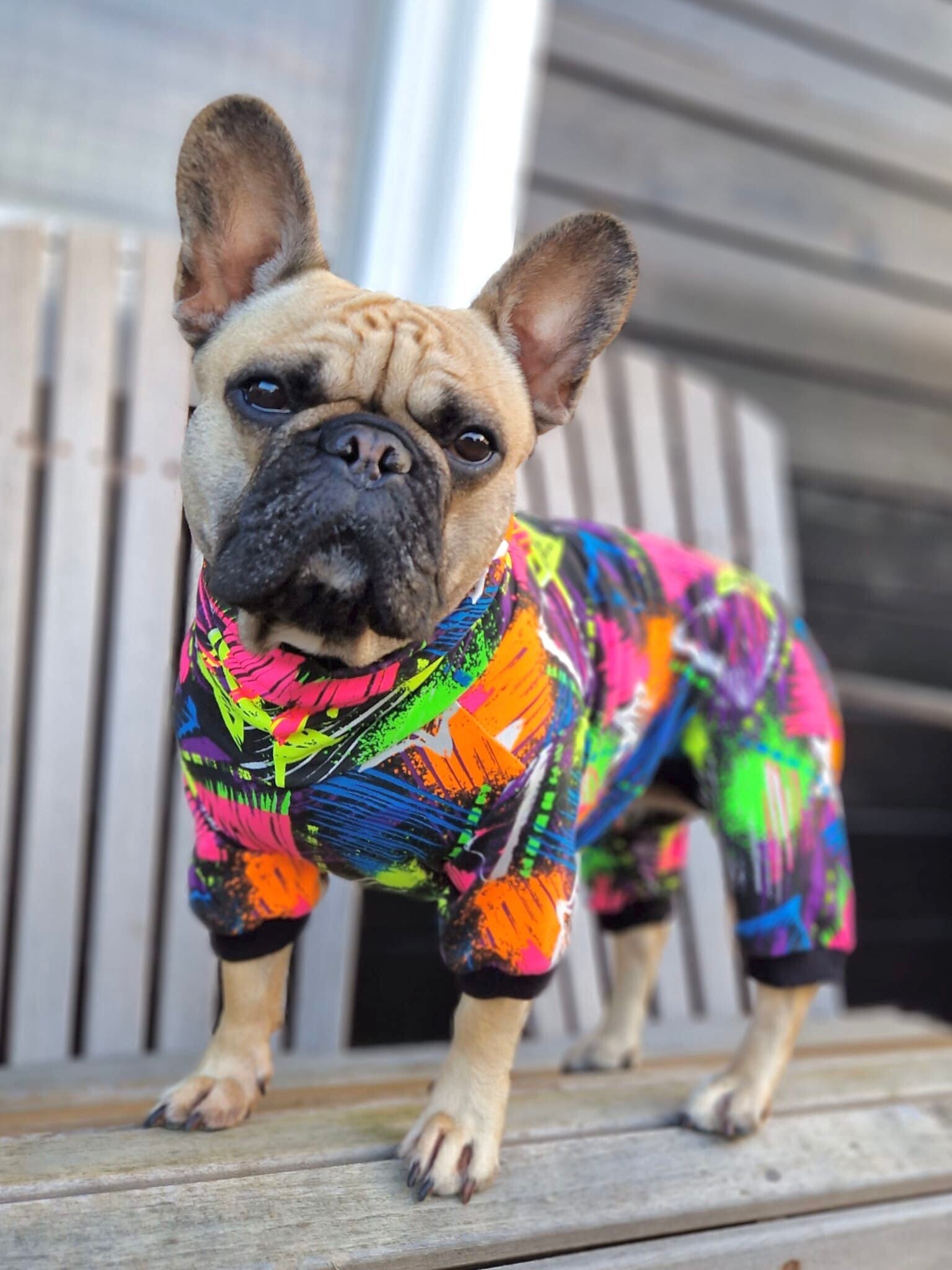 Een nieuwe kijk op de oldschool jaren 80 trend. Laat je lieveling zich een superster voelen met deze Caren B hondenpyjama met heldere neonkleuren en unieke patronen.